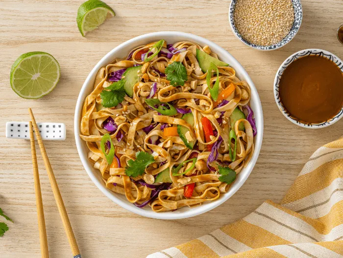 Garnish with green onions, cilantro, sesame seeds and lime.