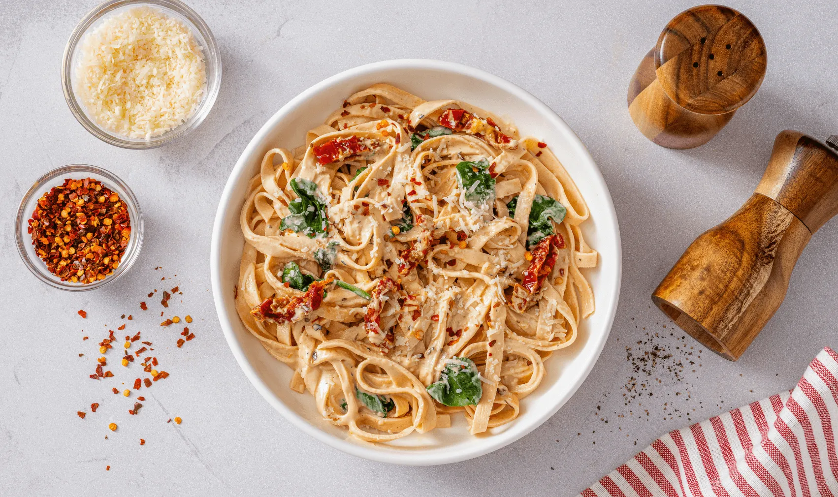 Add Parmesan cheese and spinach and mix well. Finish with red pepper flakes and enjoy!