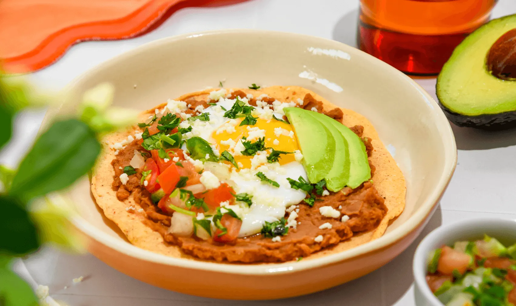 Add refried beans, fried egg, pico de gallo, sprinkle of cotija cheese, cilantro and avocado. Fold & enjoy!