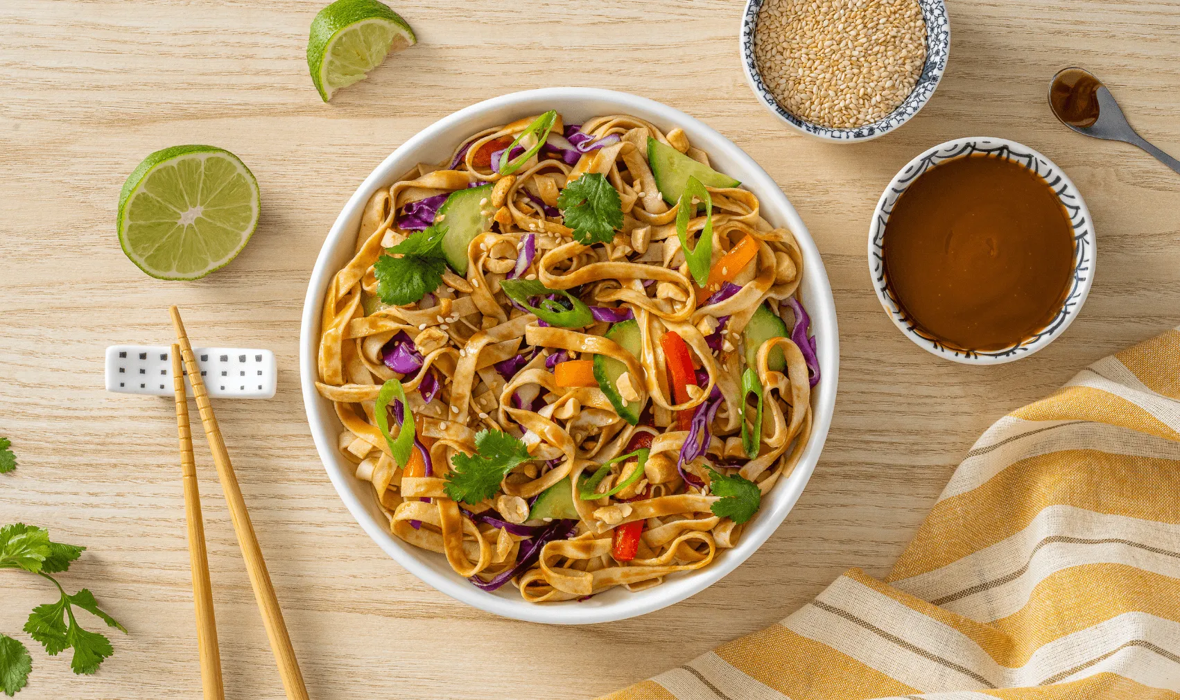 Garnish with green onions, cilantro, sesame seeds and lime.