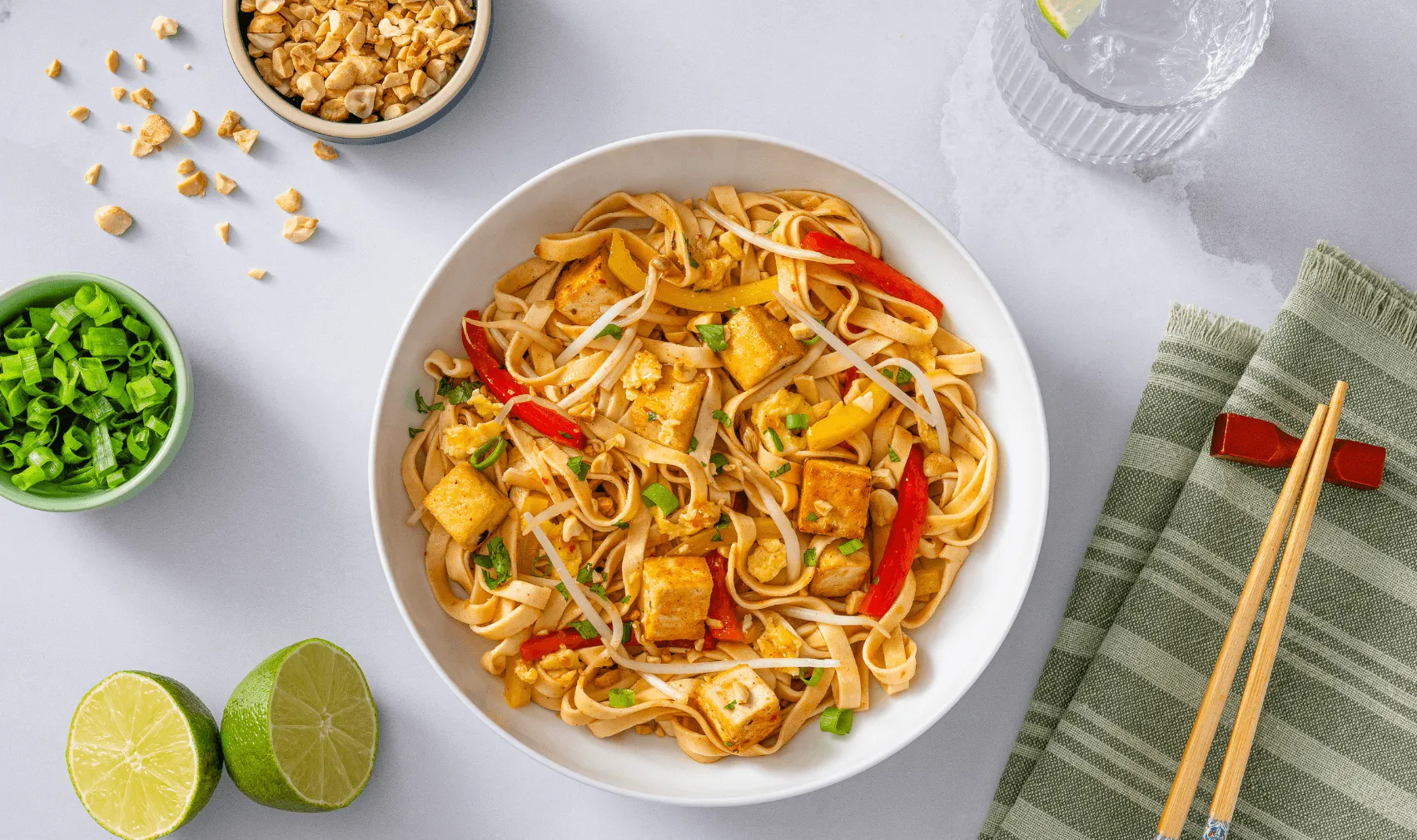 Add egglife POWER PASTA, tofu, and Pad Thai sauce to the veggie mixture. Mix well and heat until warmed.